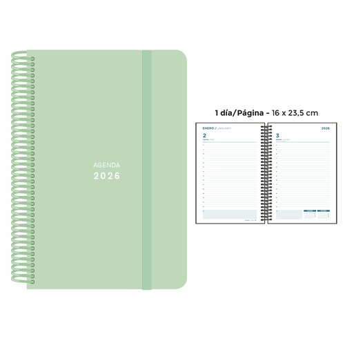 AGENDA ANUAL (2026) SENFORT PASTEL ESPIRAL tapa PP con GOMA 160x235 D/P VERDE