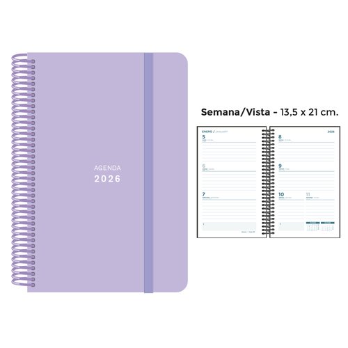 AGENDA ANUAL (2026) SENFORT PASTEL ESPIRAL tapa PP con GOMA 135x210 S/V LILA